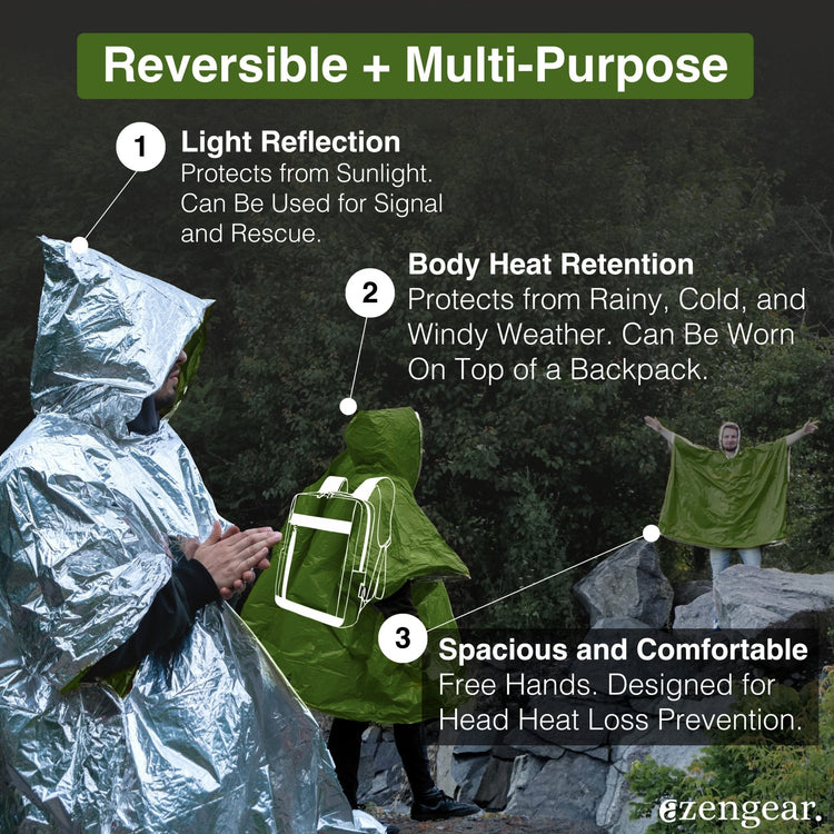 - REVERSIBLE AND PORTABLE - Unlike other emergency blankets, this poncho is double-sided: the orange/green side retains your body heat while the silver side can be used for sun protection and signal reflection to get yourself noticed from a long distance. Weighing just 80g/3oz and measuring 100*130cm/39”x51”, this hooded blanket is lightweight and compact, so you can easily pack it as a survival kit for concerts, first aid, running, camping, hiking, fishing, kayaking and other outdoor activities.