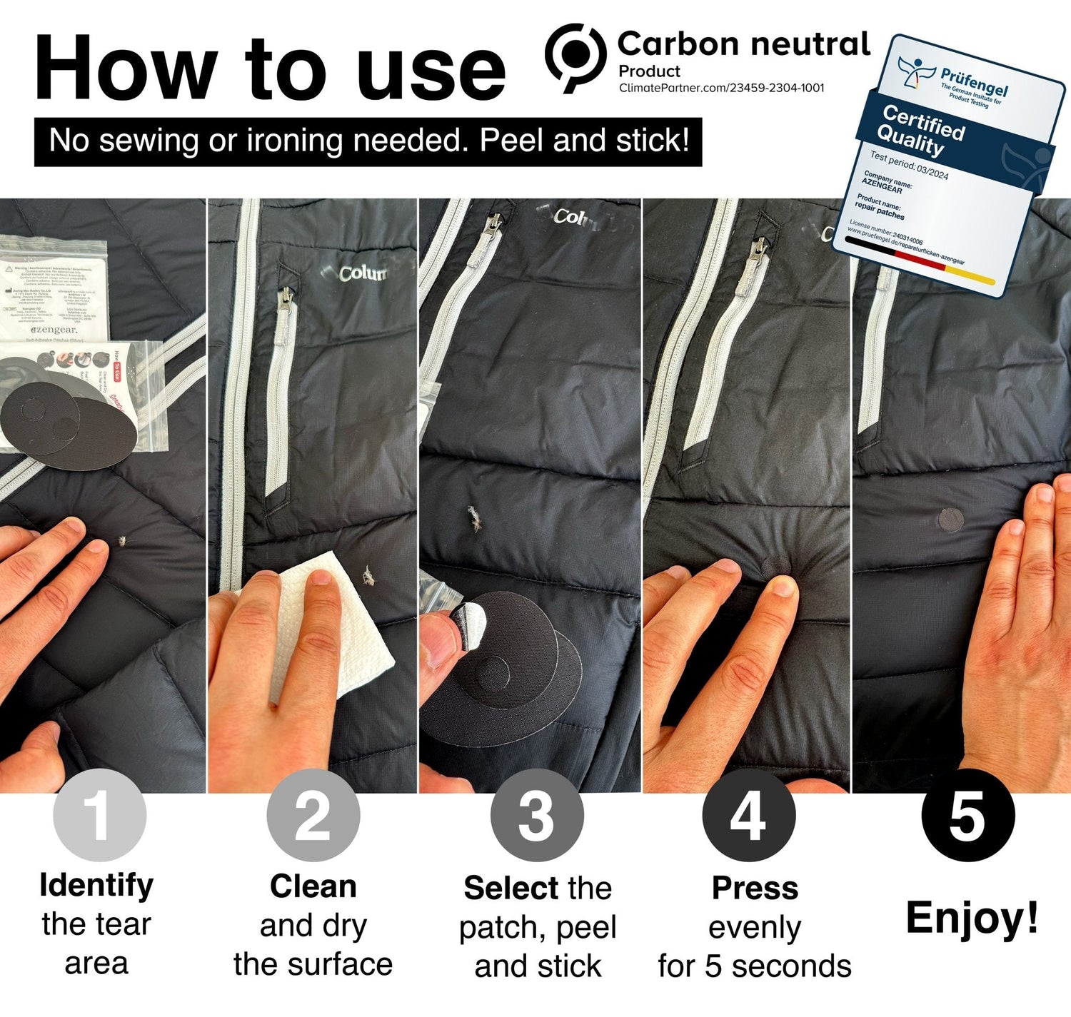 aZengear Down Jacket Repair Patches keep your outdoor gear in use with fast, no‑sew fixes. They are waterproof, self‑adhesive and built to handle everyday damage on jackets, puffer coats, ski wear, tents, sleeping bags, backpacks, upholstery and shoes.